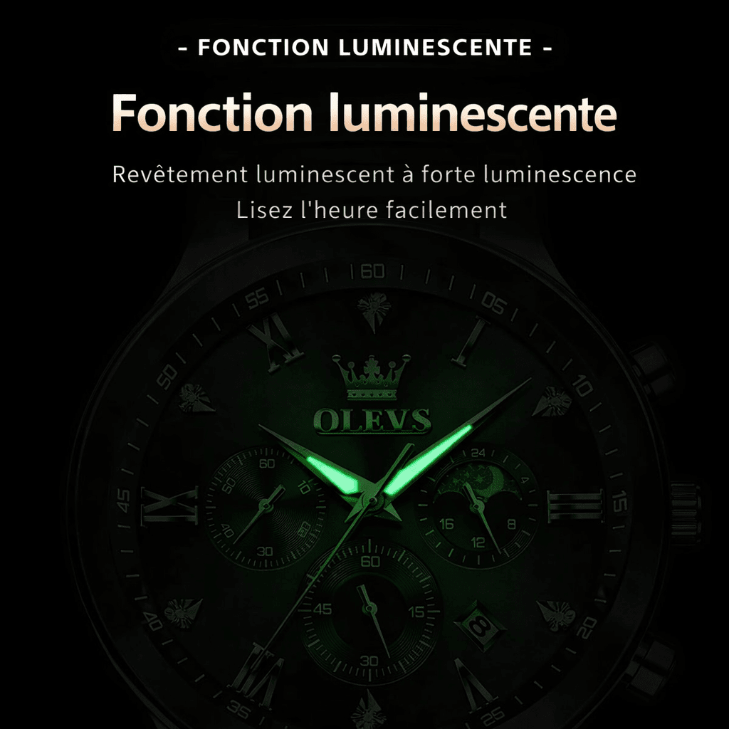 Les aiguilles et index luminescents permettent de lire l'heure facilement dans l'obscurité. Fonctionnalité pratique et essentielle.