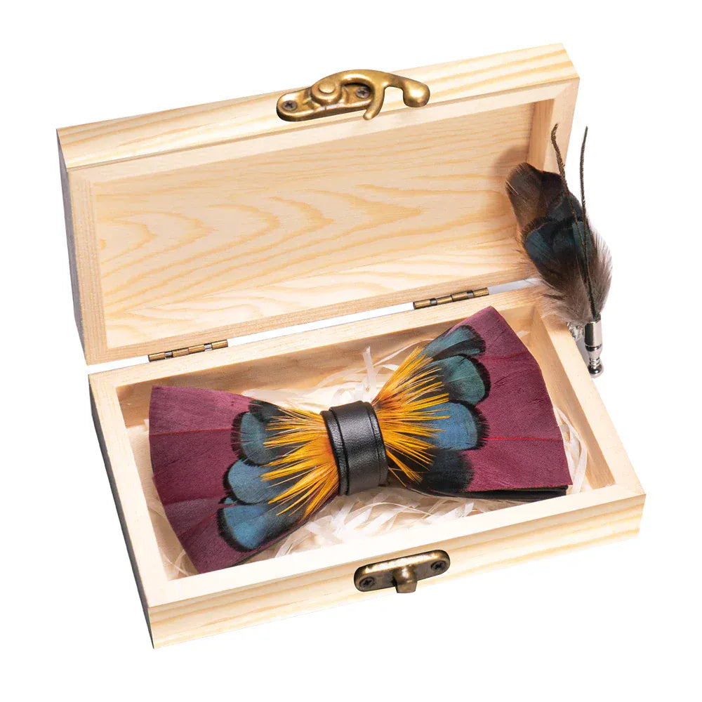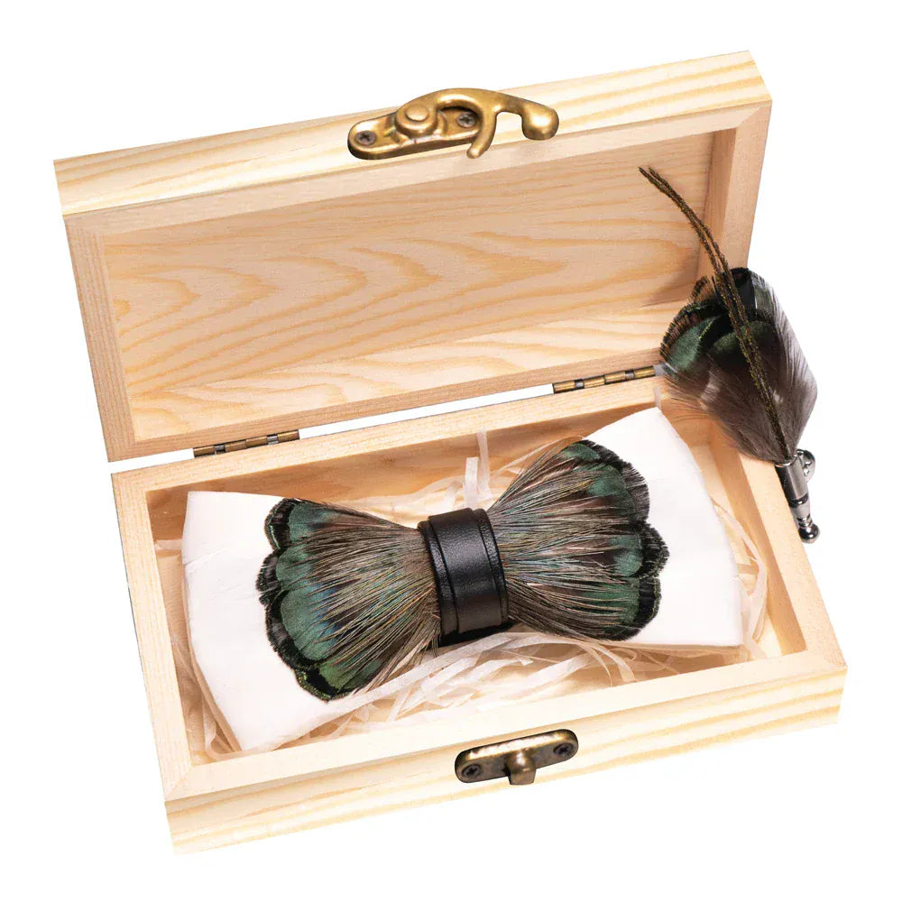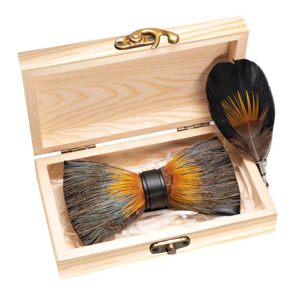 Nœud papillon plume et broches avec boîte cadeau en bois